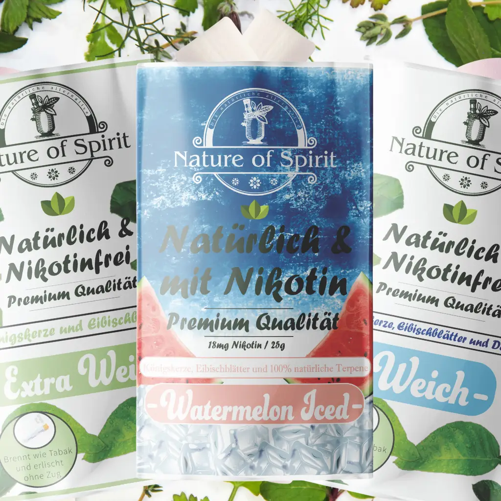 Unser Tabakersatz von „Nature of Spirit“ steht für herausragende Qualität, die Sie bei jedem Zug spüren können. Wir verpflichten uns zu 100% natürlichen Inhaltsstoffen, die sorgfältig ausgewählt und verarbeitet werden, um Ihnen ein unvergleichliches Raucherlebnis ohne Tabak zu bieten.Unsere Produkte enthalten keine künstlichen Zusatzstoffe oder schädlichen Chemikalien. Jede Charge wird gründlich getestet, um sicherzustellen, dass sie unseren hohen Standards entspricht. Dieser Einsatz für Qualität bedeutet nicht nur ein reineres Produkt, sondern fördert auch eine gesündere Alternative zum herkömmlichen Rauchen.