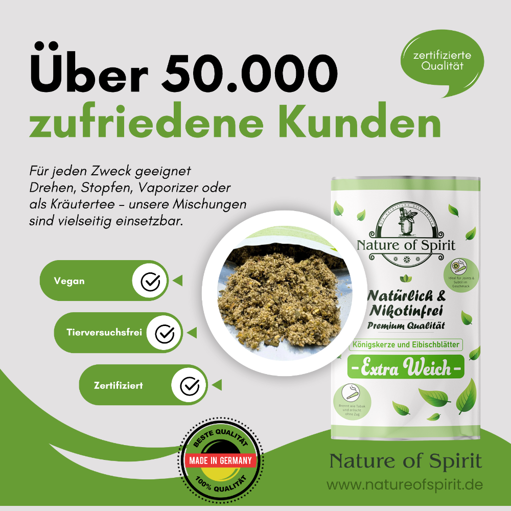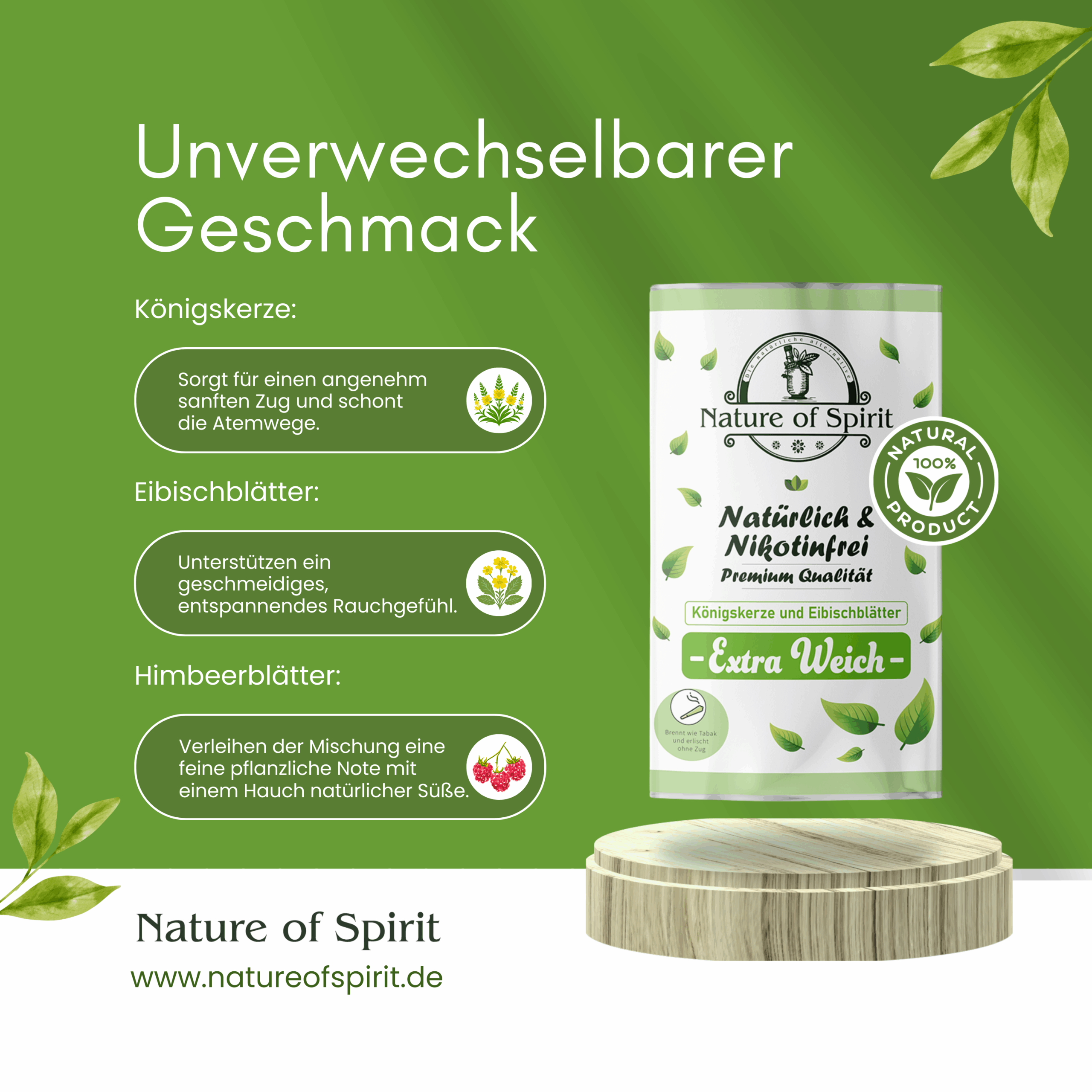 Bei Nature of Spirit verbinden wir wissenschaftliche Präzision mit kreativer Innovation, um den Tabakersatz Extra Soft zu einem einzigartigen Meisterwerk zu machen – eine gröbere, dezente Kräutermischung aus Königskerze, Eibischblättern und Himbeerblättern, veredelt mit natürlichen Kräuterextrakten für maximale Sanftheit.